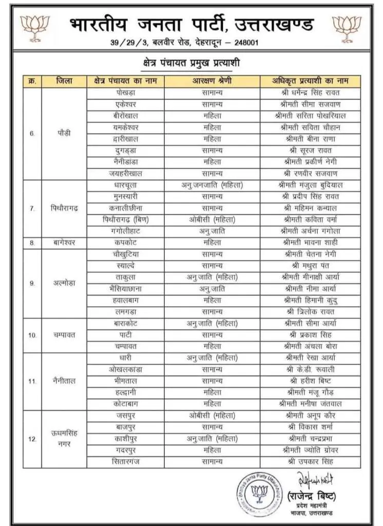 देहरादून/उत्तराखंड*** भारतीय जनता पार्टी ने प्रदेश की पंचायतों के लिए जिला पंचायत अध्यक्षों व ब्लाक प्रमुखों के अधिकृत प्रत्याशियों की प्रथम सूची जारी कर दी है। शेष चार जनपदों के लिए भी जल्द नामों की घोषणा का ऐलान पार्टी द्वारा कर दिया जाएगा।