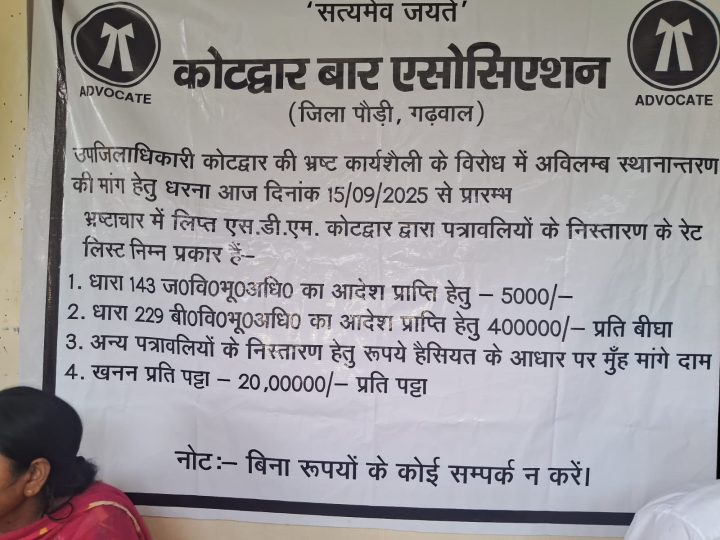 उपजिलाधिकारी कोटद्वार की भ्रष्ट कार्यशैली के विरोध में अविलम्ब स्थानान्तरण की मांग हेतु धरना आज दिनांक 15/09/2025 से प्रारम्भ