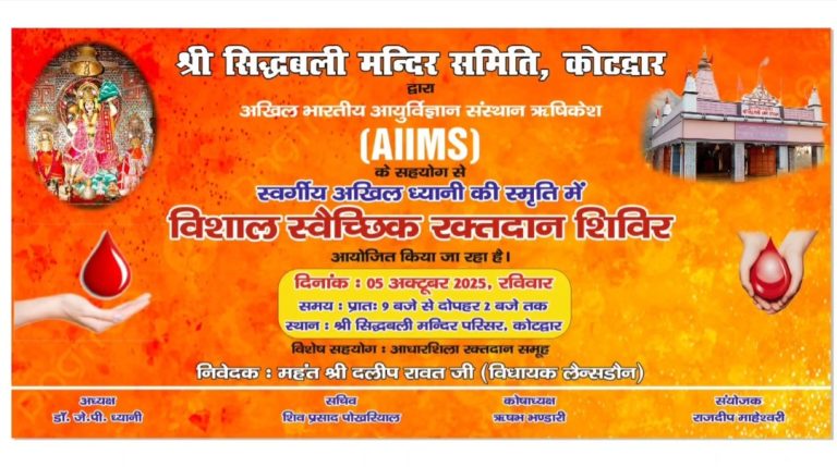 कोटद्वार: श्री सिद्धबली मन्दिर समिति द्वारा AIIMS ऋषिकेश के सहयोग हेतु 05 अक्टूबर को रक्तदान शिविर का आयोजन,,,।