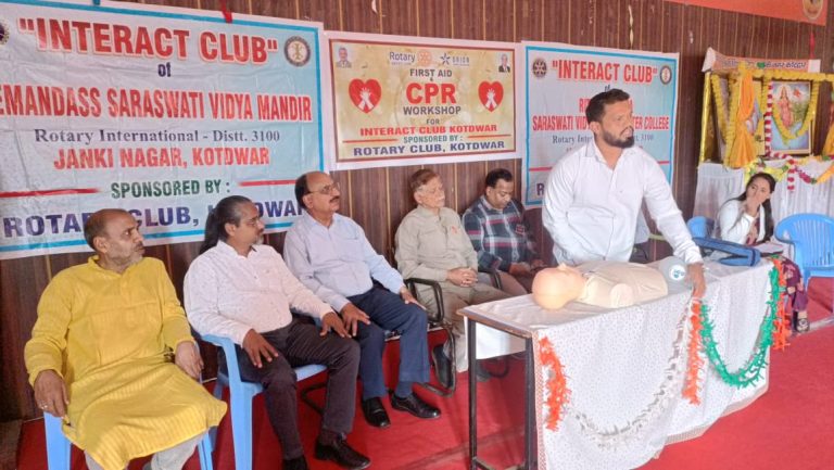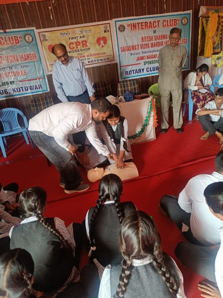 कोटद्वार/पौड़ी गढ़वाल*** रोटरी क्लब के तत्वावधान मे इन्ट्रेक्ट क्लब रितेश शर्मा सरस्वती विघा मन्दिर इण्टर कालेज जानकीनगर के छात्र-छात्राओ को फर्स्ट एड एवं सी पी आर के सम्बन्ध मे जानकारी देने हेतु एक कार्यशाला का आयोजन किया गया ।