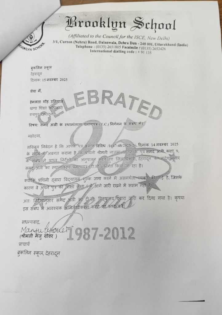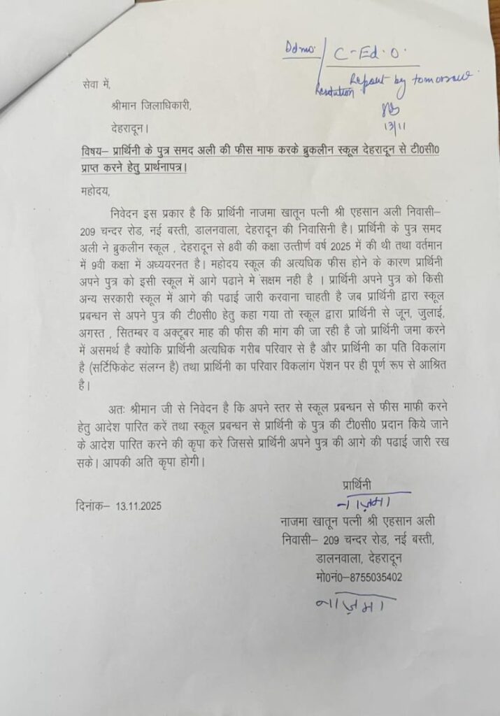 देहरादून/उत्तराखंड*** विगत दिवस 13 नवम्बर 2025 को चन्दर रोड निवासी नाजमा खातून ने डीएम से गुहार लगाई कि उनके बेटे समद अली ने ब्रूकलीन स्कूल से 08 वीं की परीक्षा उर्तीण तथा 9 वीं कक्षा में अध्ययनरत् है। विद्यालय की फीस अधिक होने के कारण वह उस स्कूल में बच्चे की पढाई जारी रखने में सक्षम नही है। आगे की पढाई अन्य स्कूल से कराना चाहती हैं तथा जून से अक्टूबर तक की फीस स्कूल में जमा न करवा पाने के कारण स्कूल प्रबन्धन टीसी नही दे रहा है,जिससे बच्चे की पढाई बाधित हो रही है। पति दिव्यांग है तथा वह फीस भरने में असमर्थ है।