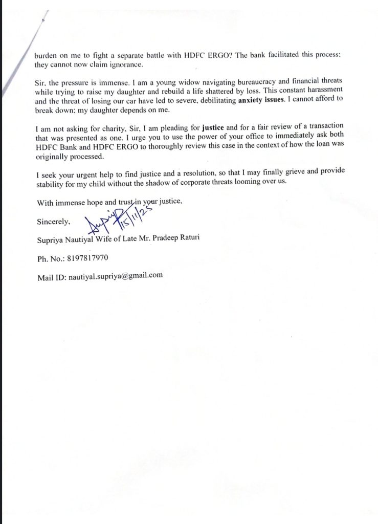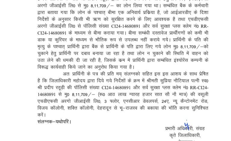 देहरादून/उत्तराखंड*** विगत दिवस फरियादी सुप्रिया नौटियाल पत्नी स्व० प्रदीप रतूड़ी द्वारा एक जिलाधिकारी सविन बसंल के समक्ष 15 नवम्बर 2025 गुहार लगाई कि उनके पति प्रदीप रतूड़ी द्वारा वाहन कय किये जाने हेतु प्रबन्धक, एचडीएफसी आरगो जीआईसी लि० से मु० 8,11,709/- का ऋण लिया गया था। सम्बंधित बैंक के द्वारा बताया गया कि लोन के पश्चात् बीमा एक अनिवार्य प्रक्रिया है, जो आईआरडीए के दिशा निर्देशों के अनुसार किसी भी ऋण को सुरक्षित करने के लिए आवश्यक है तथा एचडीएफसी अरगो जीआईसी लि० से पॉलिसी संख्या सीआई 24-14680 और सर्व सुरक्षा प्लस क्लेम नं० आरआर-सीआई 24-14680891 के माध्यम से बीमा कराया गया। बीमा सम्बंधी दस्तावेज कभी भी डाक या कुरियर के माध्यम से भौतिक रूप से उपलब्ध नहीं कराये गये। उनके पति की मृत्यु के पश्चात् सुप्रियाय द्वारा बैंक से अपने पति द्वारा लिए गये लोन मु0 8,11,709/- को चुकाने हेतु दबाव बनाया जा रहा है तथा लोन न चुकाने की स्थिति में वाहन को उठा लेने की धमकी दी जा रही है, जिसके लिए सुप्रिया द्वारा सम्बंधित इंश्योरेंस कम्पनी के विरूद्ध कार्यवाही किये जाने का अनुरोध जिलाधिकारी से किया गया है।