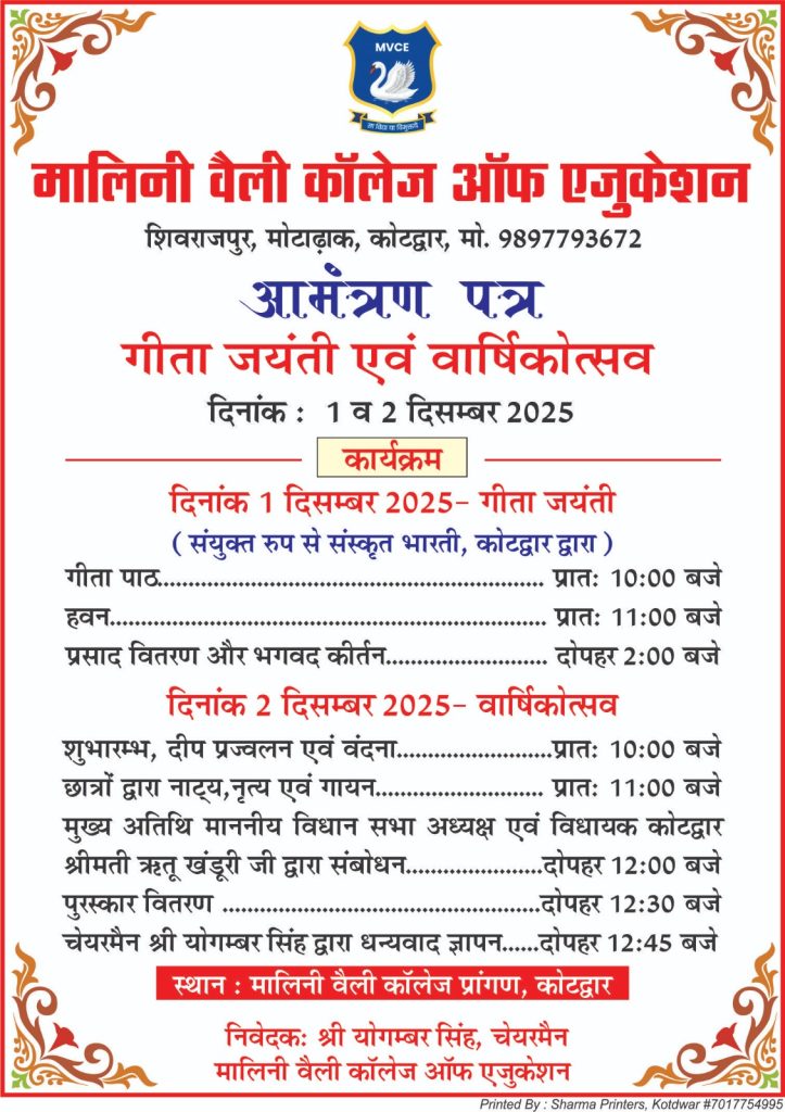 कोटद्वार/पौड़ी गढ़वाल*** संस्कृत भारती, कोटद्वार और मालिनी वैली कॉलेज ऑफ़ एजूकेशन, कोटद्वार के द्वारा संयुक्त रूप से गीता जयन्ती के उपलक्ष्य में कार्यक्रम आयोजित किया गया। कार्यक्रम की शुरुआत में परमार्थ वैदिक गुरुकुल कण्वाश्रम के प्रधानाचार्य मनमोहन नौटियाल तथा उनके शिष्यों के नेतृत्व में सामूहिक रूप से गीता के पन्द्रहवें अध्याय का पाठ किया गया। तत्पश्चात् हवन किया गया। और इसके बाद गढ़-कुमाऊं कीर्तन मण्डली, शिवराजपुर के द्वारा भगवद् कीर्तन का आयोजन किया गया। रा0ई0का0 कोटद्वार के संस्कृत शिक्षक डॉ0 कुलदीप मैन्दोला द्वारा भगवद् गीता के महात्मय पर प्रकाश डाला गया। कार्यक्रम का समापन प्रसाद वितरण द्वारा हुआ। कार्यक्रम में मालिनी वैली कॉलेज के चेयरमैन योगम्बर सिंह, उषा रावत, डायरेक्टर स्वेता रावत, प्रभारी प्राचार्या डॉ0 प्रभा जोशी, प्रकाश चंद्र डॉ0 रूनुमी शर्मा, नूतन कुकरेती, मानसी, व बी0एड0 के छात्र-छात्राएं तथा संस्कृत भारती कोटद्वार से डॉ0 रमाकांत कुकरेती एवं डॉ0 कुलदीप मैन्दोला तथा डॉ0 मंजू कापरवान और बीना पाण्डेय सहित अन्य स्थानीय गणमान्य लोग शामिल हुए। इससे पूर्व संस्कृत भारती, कोटद्वार और मालिनी वैली कॉलेज ऑफ एजुकेशन के द्वारा तीन दिवसीय ऑनलाइन भगवतगीता अध्याय 15 की उच्चारण एवं व्याख्या कक्षा चलाई गई थी, जिसका पारायण इस कार्यक्रम में हुआ।
