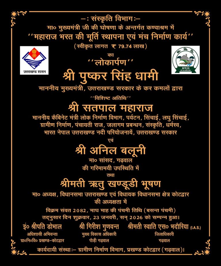 कोटद्वार/पौड़ी गढ़वाल*** बसंत पंचमी के शुभ अवसर पर कोटद्वार स्थित ऐतिहासिक एवं पौराणिक स्थल कण्वाश्रम में विधानसभा अध्यक्षा ऋतु खण्डूडी भूषण ने चक्रवर्ती सम्राट भरत की भव्य प्रतिमा का अनावरण किया। कण्वाश्रम में आयोजित चार दिवसीय मेले के समापन अवसर पर प्रदेश के मुख्यमंत्री पुष्कर सिंह धामी ने वीडियो संदेश के माध्यम से क्षेत्रवासियों को बसंत पंचमी की शुभकामनाएं देते हुए कोटद्वार विधानसभा क्षेत्र के लिए विभिन्न विकासात्मक घोषणाएं कीं।