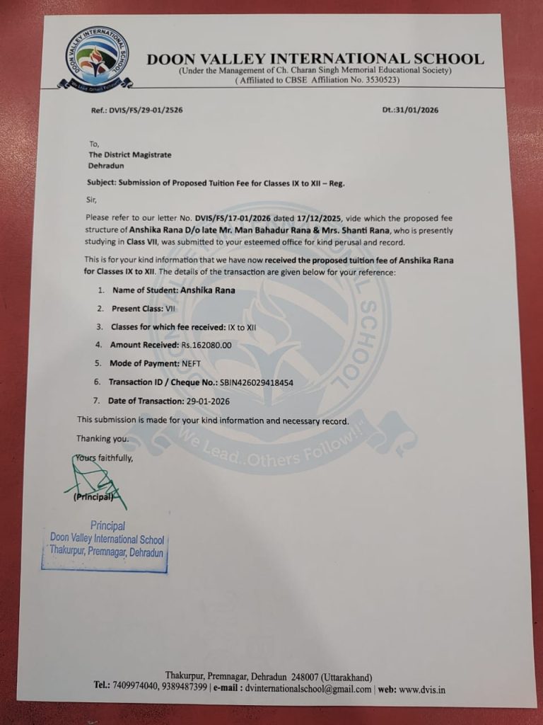 मा0 मुख्यमंत्री के निर्देश पर जिला प्रशासन ने विधवा शांति राणा की 8वीं में पढ रही बेटी अंशिका की कक्षा 12 तक 1.62 लाख फीस कराई स्कूल प्रबन्धन के खाते में एकमुश्त जमा करा दी है। जिलाधिकारी सविन बंसल की अध्यक्षता में विगत नवम्बर माह में आयोजित जनता दर्शन कार्यक्रम के दौरान शांति राणा ने अपनी पीड़ा साझा की थी। उन्होंने बताया कि उनके पति मनबहादुर ने परिवार की आजीविका के लिए ई-रिक्शा क्रय करने हेतु 3,72,600 रुपये का बैंक ऋण लिया था। दुर्भाग्यवश एक सड़क दुर्घटना में उनके पति की मृत्यु हो गई, जिसके बाद परिवार में कोई कमाने वाला शेष नहीं रहा। वर्तमान में शांति राणा की 12 वर्षीय पुत्री अंशिका, 5 वर्षीय पुत्र अक्षय एवं एक अन्य किशोर पुत्र है, जिनके भरण-पोषण और सीमित संसाधनों के चलते वह ऋण की किश्तें जमा करने में असमर्थ थीं।