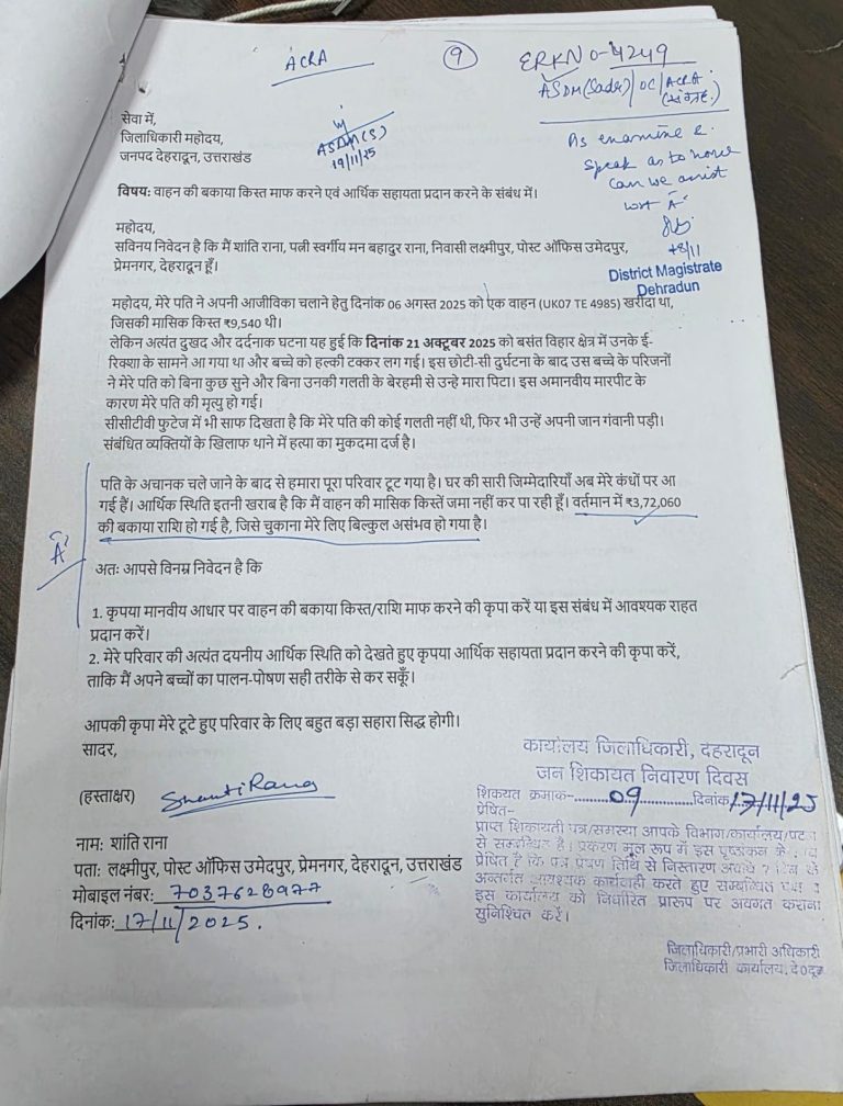 शांति राणा द्वारा जिलाधिकारी के समक्ष अपनी अत्यंत दयनीय आर्थिक स्थिति का उल्लेख करते हुए ऋण राहत तथा आर्थिक सहायता का अनुरोध किया गया था। मामले की गंभीरता एवं मानवीय पक्ष को देखते हुए जिलाधिकारी सविन बंसल ने उप जिलाधिकारी (न्याय) को प्रकरण की सम्यक जांच कर नियमानुसार त्वरित राहत सुनिश्चित करने के निर्देश दिए थे।