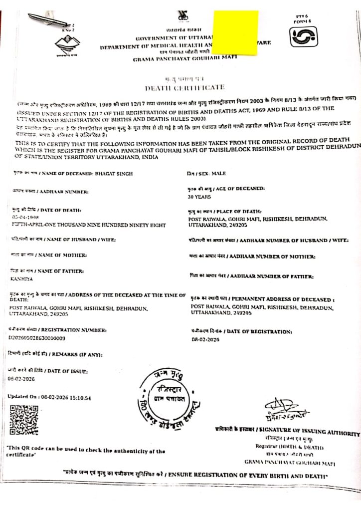 वेतन रोकने की कार्रवाई के तत्पश्चात संबंधित ग्राम पंचायत विकास अधिकारी, ग्राम पंचायत गौहरी माफी द्वारा प्रदीप सिंह के पिता स्व० भगत सिंह तथा बलबीर सिंह रावत की माता स्व० जयवन्ती देवी का मृत्यु प्रमाण पत्र 08.02.2026 को जारी कर दिया गया है। प्रकरण के निस्तारण उपरांत जिला पंचायत राज अधिकारी, देहरादून के वेतन आहरण पर लगी रोक हटाए जाने के संबंध में पत्रावली उच्च स्तर पर प्रस्तुत की गई है। जिला प्रशासन के सख्त निर्देश हैं कि जनमानस की शिकायतों के निस्तारण में किसी भी प्रकार की लापरवाही पर क्षम्य नही होगी। अधिकारियों को निर्देशित किया गया है कि समयबद्ध एवं पारदर्शी कार्यप्रणाली सुनिश्चित करना सभी अधिकारियों की जिम्मेदारी है। इसमें किसी भी प्रकार की हिलाहवाली स्वीकार्य नहीं होगी ।