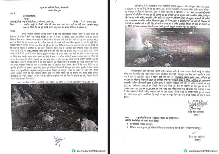जिलाधिकारी द्वारा खनन विभाग को उत्तराखण्ड खनिज (अवैध खनन, परिवहन एवं भण्डारण का निवारण) नियमावली-2021 एवं संशोधित भण्डारण नियमावली-2024 के नियम 14(5)(क) तथा उत्तराखण्ड उपखनिज परिहार नियमावली-2024 के नियम 57(1) के अंतर्गत कार्रवाई करने के निर्देश दिए गए हैं। अवैध खनन की कुल मात्रा 1522.50 घनमीटर / 4384.80 टन (मिट्टी मिश्रित चूना पत्थर) पाई गई है। इस पर रॉयल्टी की तीन गुना दर से (4384.80 × 88.50 × 3) कुल ₹11,64,164/- (रुपये ग्यारह लाख चौसठ हजार एक सौ चौसठ मात्र) अर्थदण्ड निर्धारित किया गया है, जिसकी सम्बन्धितों से की जाएगी। जिला प्रशासन ने स्पष्ट किया कि राष्ट्रीय राजमार्ग एवं सार्वजनिक संपत्ति को क्षति पहुँचाने वालों के विरुद्ध कठोरतम कार्रवाई की जाएगी तथा जनसुरक्षा से किसी प्रकार का समझौता नहीं किया जाएगा।