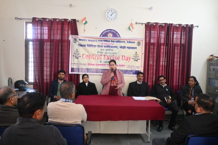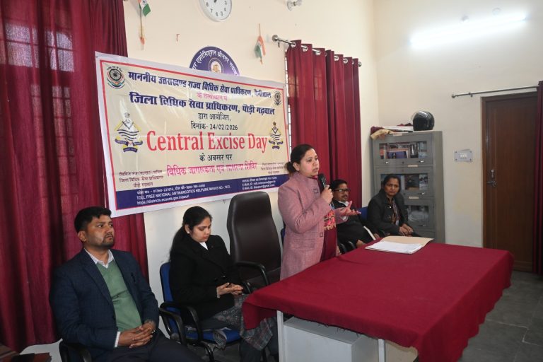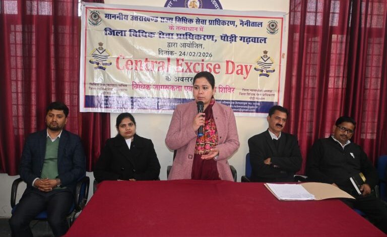 पौड़ी गढ़वाल/उत्तराखंड*** उत्तराखण्ड राज्य विधिक सेवा प्राधिकरण, नैनीताल एवं जिला जज/अध्यक्ष, जिला विधिक सेवा प्राधिकरण, पौड़ी गढ़वाल के निर्देशानुसार तथा सिविल जज (सीनियर डिवीजन)/सचिव, जिला विधिक सेवा प्राधिकरण नाज़िश कलीम के निर्देशन में केन्द्रीय उत्पाद शुल्क दिवस के अवसर पर विधि भवन सभागार, श्रीनगर में विधिक जागरूकता शिविर का आयोजन किया गया।