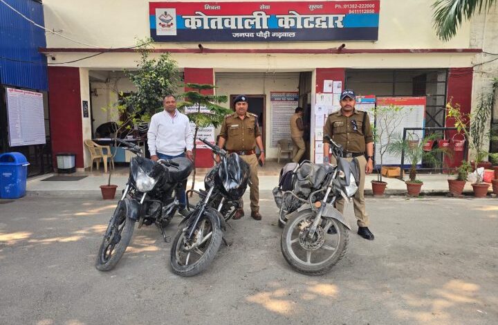 कोटद्वार/पौड़ी गढ़वाल*** दिनांक 22.02.2026 को पिंटू सिंह, मोहित सालार एवं राजेश कुशवाहा निवासी- कोटद्वार द्वारा कोतवाली कोटद्वार में लिखित शिकायती प्रार्थना पत्र दिया गया जिसमें उनके द्वारा अंकित किया गया कि किसी अज्ञात व्यक्तियों द्वारा उनकी मोटरसाइकिलें चोरी की गई हैं प्राप्त शिकायती प्रार्थना पत्रों के आधार पर कोतवाली कोटद्वार में क्रमशः मु0अ0सं0- 39/2026, धारा- 303(2) BNS, मु0अ0सं0- 40/2026, धारा- 303(2) BNS व मु0अ0सं0- 41/2026, धारा- 303(2) BNS के अंतर्गत अभियोग पंजीकृत किए गए।